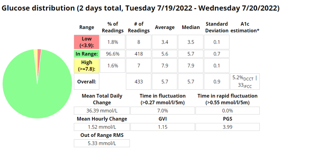 Ideally I want to see a time-in-range (TIR – 3.9-7.8 mmol/l) exceeding 90% with an average in the low sixes and a standard deviation (SD) around one (1).