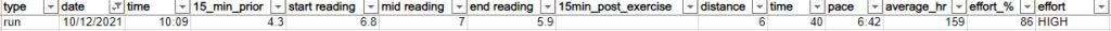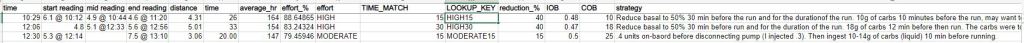 I have included the table I have been updating while I work on the Python code, which doesn’t seem to accurately reflect the amount of hypo events I have experienced while running. On the whole cardio has been the item on my list I have struggled with the most, and has been a significant source of anxiety. I am quite certain that after a few months I will have a strategy nailed down and the anxiety associated with exercise will wane. As can be seen in the below table, I am currently focusing on running as its the exercise I am struggling to gain control over the most. I was able to stay in range for the entire duration of all my weight sessions.