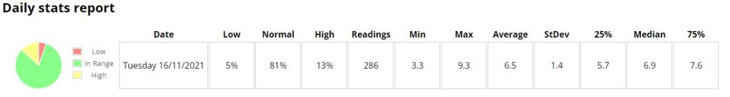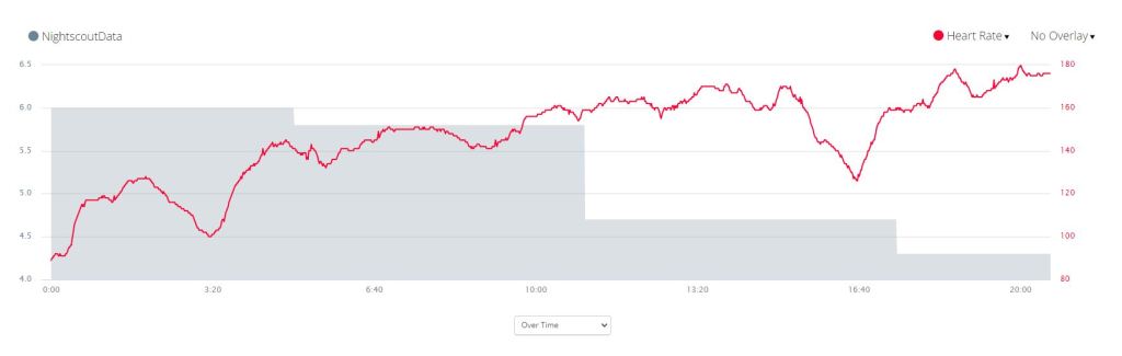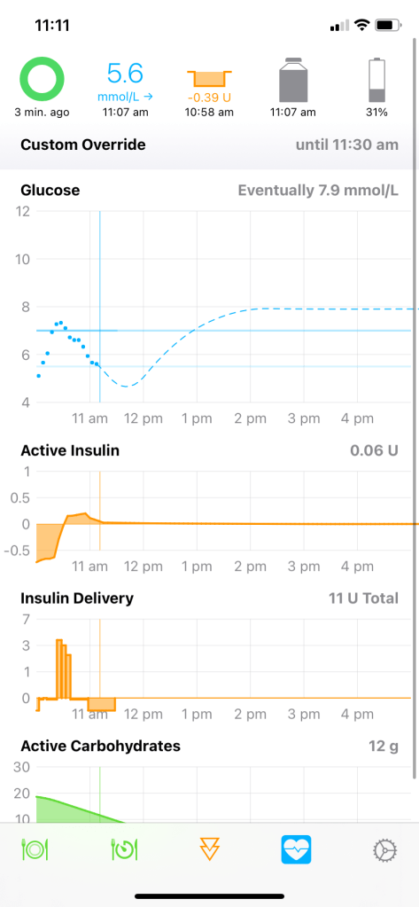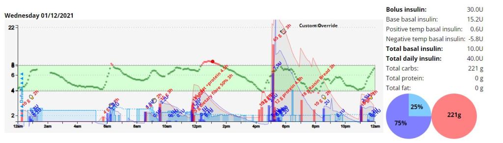 The daily stats are definitely improving as can be seen by my time in range (TIR) stats above. The morning basal testing revealed that I needed to increase by basal from about 6am up from .8 U/hour to at least 1.1. U/hour, further testing is still required in order to confirm these numbers. I had around 100g of carbs, including ‘fake carbs’ which is added into Loop as 25% of protein and 10% of fat per meal. I’m still not convinced that Loop is particularly effective at managing gluconeogenesis (the conversation of protein and fat into carbohydrates) as I find that if I use 4 hour digestion times I go low and 5 hour digestion times I spike slightly. I suppose more testing in needed π