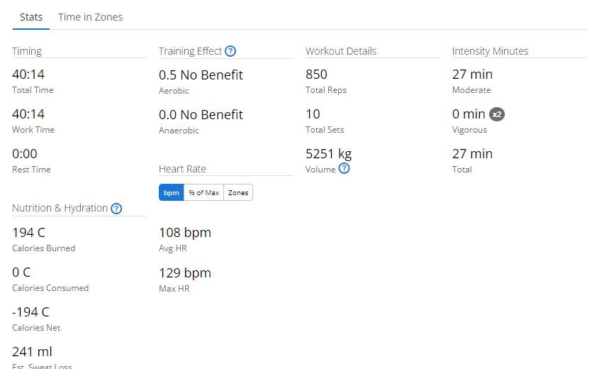 A gruelling 40 minutes with 5.2 Tons of weight being moved (at least according to Garmin’s calculation from me inputting exercise name and weight), which as expected is less than my last arm session where I moved 5.6 Tons. I’m fairly impressed I did as much as I did, as I was expecting much less.
