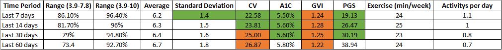 As can be seen in the charts above, some slight improvements are seen in all metrics discussed above with a 7.6% reduction in TIR and a 4.5% (-0.3) reduction in average blood glucose. The GVI and PGS metrics reflect modest variability and good control, as opposed to the previous non-diabetic results. I spent 22min (2%) in the 3-3.9 mmol/l range, down 10min from the previous periods 32min.