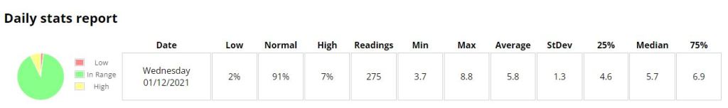 My December update is quite pleasing. I am almost at 90% in range (3.9 – 7.8) and I am eating about 30% more carbs than I ate previously to achieve these numbers. I am not sure if I mentioned this before but I did a 30 day muscle building challenge about 3 months ago and one of the difficulties I experienced was eating more calories (to gain muscle) and staying in range. I am very happy with the 5.5% A1C and the standard deviation of 1.4. I would prefer to be 1 or under but with the introduction of more carbs that’s rather difficult to achieve at the moment.