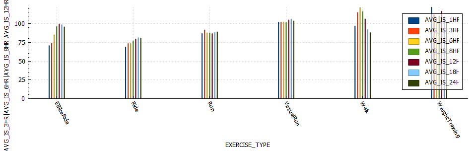PUMP: I am not experiencing the sudden insulin sensitivity increase I did while on MDI. I believe this to be due to the fact that on MDI I cant reduce basal, but with the pump I can decrease basal as required. Be careful not to decrease your basal too much as your blood sugar will increase due to an inability to utilise glucose effectively. If you are using Loop then you could start a temporary over-ride to adjust insulin delivery for the remainder of the day. AAPS is capable of adjusting insulin requirements using a function called autosens which monitors deviations in insulin requirement. Below is a chart of insulin sensitivity post exercise grouped by exercise type.