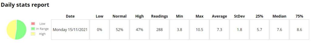 Last night went fairly well. The only big mistake I made was not injecting for protein/fat, but my guesstimates seemed to be pretty decent. Overall my weekly average is coming down, slowly but surely.